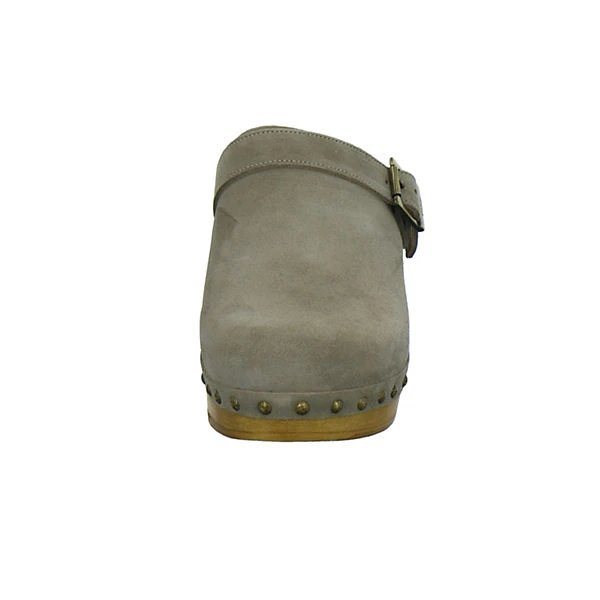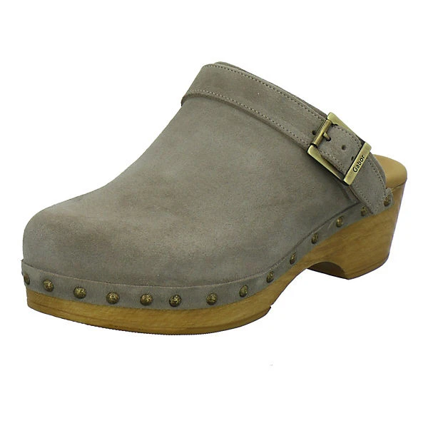 Gabor zeigt eine tolle Pantolette. Der Clog ist aus hochwertigem Veloursleder und Holz gefertigt, dieses schafft eine besondere Mischung aus rustikal und adrett. Das Nietendekor und aufgesetzte Zierschnalle runden das Design ab. Mit diesem lässigen Schuh geht man immer wieder gerne vor die Tür.