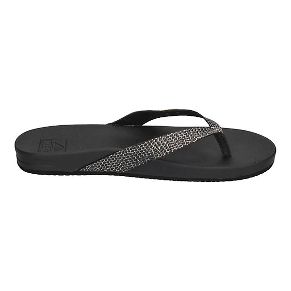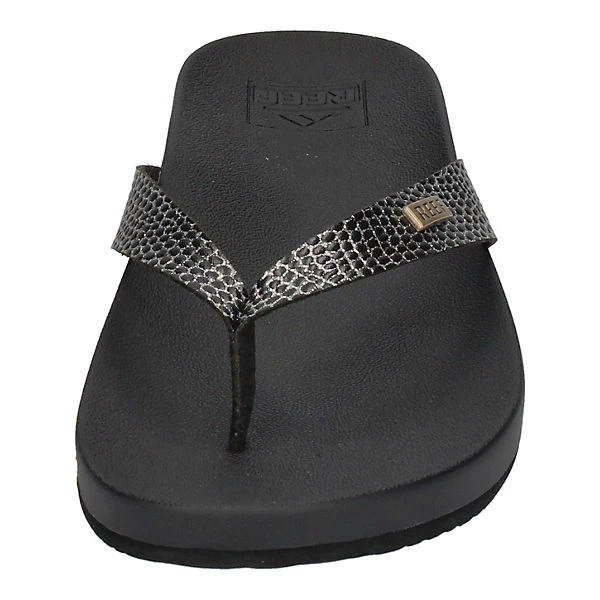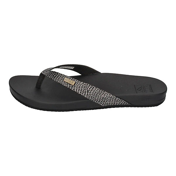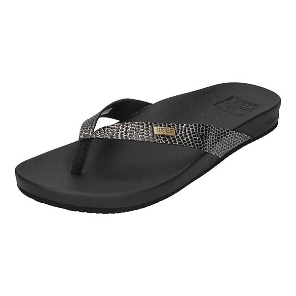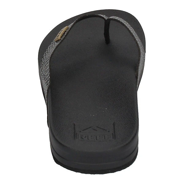 Nicht nur am Strand sondern auch in der City machen die Zehentrenner Cushion Court in schwarz von Reef eine gute Figur. Durch den am Ansatz breiteren Riemen hat der Fuß guten Halt und das weiche, vorgeformte Fußbett sorgt dafür, daß Frau wie auf Wolken geht. Dieser Sommerschuh passt hervorragend zu vielen Sommerlooks – vom Sommerkleid bis zur Jeans.