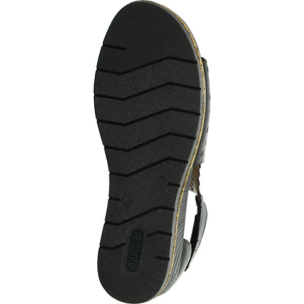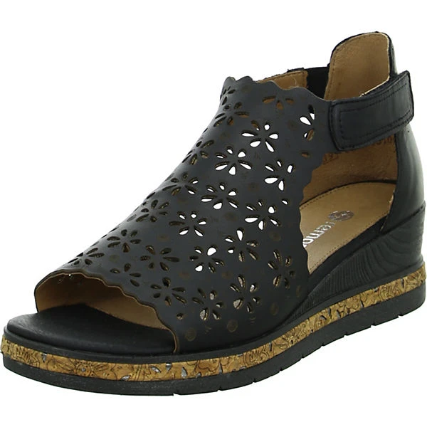Mit dekorativem Lochstanz-Blumenmuster und hochgezogener Front sind die schwarzen Keisandalen von Remonte ein schöner Anblick. Die Damen-Sandaletten sind mit einem elastischen Einsatz im seitlichen Schaftbereich und praktischem Klettverschlussriemen versehen. Eine gepolsterte Leder-Decksohle sorgt für Komfort und ein korkähnliches, geblümtes Sohlenband verleiht den Sommerschuhen zusätzlichen, natürlichen Charme.