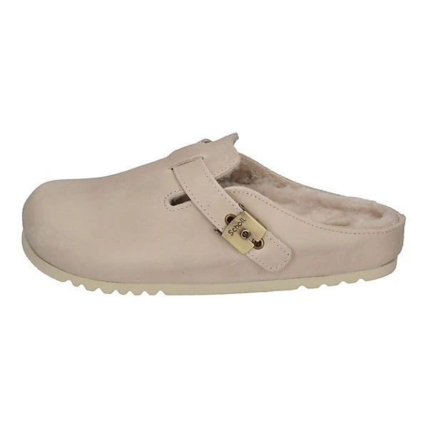 Obermaterial: Glattleder Innenmaterial: Kunstfell Fußbett aus Kork Laufsohle aus leichtem EVA Weite minimal verstellbar durch die patentierte Scholl-Schnalle Höhe der Sohle: ca. 3 cm Made in Spain Diese Schuhe fallen normal aus Marke: Scholl Modell: Grace