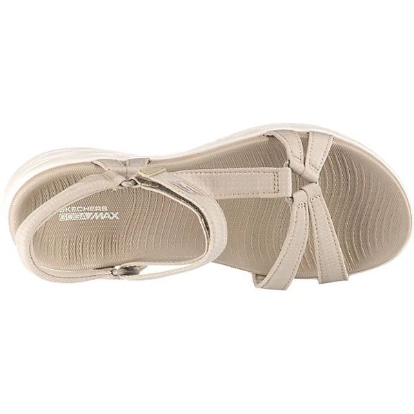 Skechers On-The-Go 600 Damen Sandalen „Brilliancy“ Beige mit Ziernähten, feiner Musterung und glitzernder Fußbettung gepolstertes Fersenriemchen Klettverschlüsse 5GEN®-Zwischensohle: sorgt für Komfort und Reaktivität 5GEN®-Zwischensohle: sorgt für Komfort und Reaktivität Goga Max®-Technologie: für innovative Dämpfung und zusätzlichen Halt flexible, leichte Laufsohle weiche Fußbettung