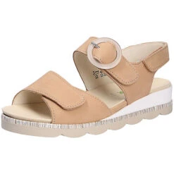 Bequeme Damensandale mit Comfort der Marke Waldläufer aus einem feinen hochwertigem Nubukleder.Die angeraute Oberfläche ist besonders weich und gibt dem Leder ein angenehmes Gefühl. Das exzellente Innenleben aus bestem Leder gibt Ihnen ein erholsames Gefühl an langen Tagen. Durch die auswechselbare Decksohle ist es möglich, eigene Einlagen zu verwenden. Geschnitten ist der Schuh für extra breite Füße (Weite K). Der Keilabsatz hat eine Höhe von cirka 2 cm ,für gute Bodenhaftung sorgt die abriebfeste und griffige Gummisohle. Ein Klettverschluß zum einfachen und bequemen an- und ausziehen sorgt für einen guten Halt.Ebenfalls ist eine stufenlose Anpassung an den Fuß möglich. Die Schuhgröße fällt regulär aus.